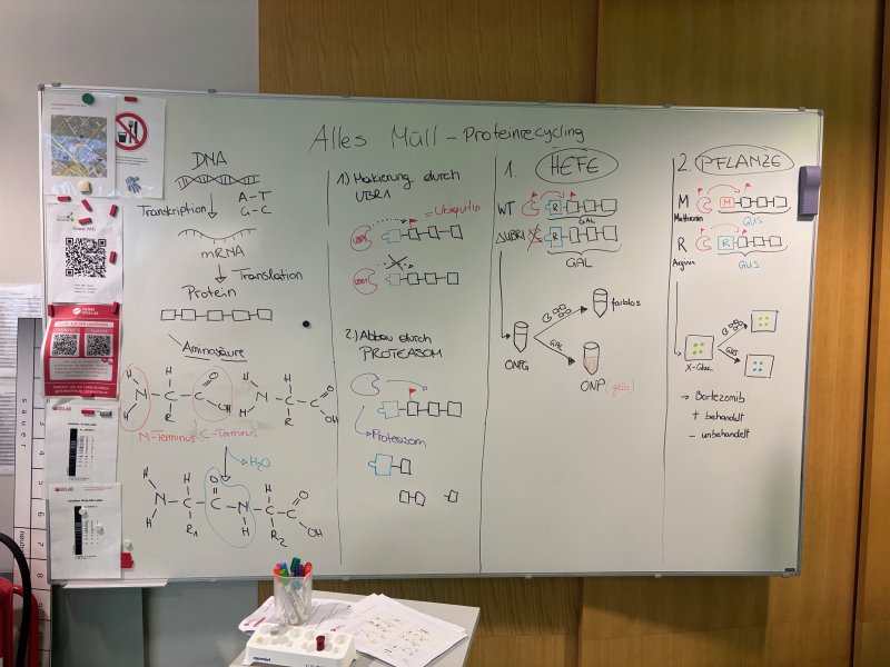 Im ersten Teil arbeitete die Klasse mit Inhalten, die in Zusammenarbeit mit Wissenschaftler:innen des Sonderforschungsbereichs Targeted Protein Degradation und der Forschungsgruppe von Andreas Bachmaier an den Max Perutz Labs entwickelt wurden. Proteinabbau spielt eine zentrale Rolle in der modernen Krebsforschung: Wird ein krankheitsrelevantes Protein gezielt abgebaut, kann das Tumorwachstum gestoppt oder Krebszellen sogar gezielt ausgeschaltet werden. Mithilfe eines Farbassays wurden die Abbauprozesse sichtbar gemacht, sodass die Schüler:innen beobachten konnten, welche Signale den Proteinabbau fördern oder hemmen.
