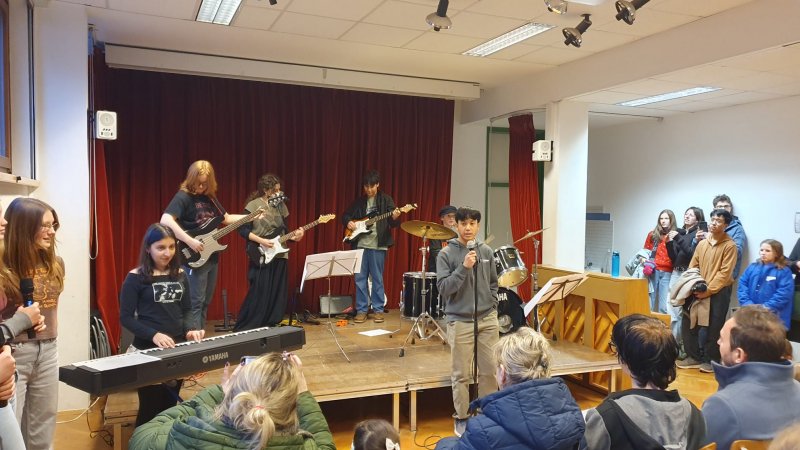 Im Mehrzweckraum sorgte ein vielfältiges Bühnenprogramm für beste Unterhaltung: Die neu gegründete Schulband begeisterte mit ihrem ersten öffentlichen Auftritt, das Vocal-Ensemble sorgte für musikalische Stimmung und die interaktiven Erasmus+-Kahoot-Quizze luden zum Mitmachen und Mitraten ein.