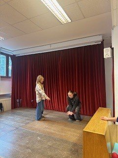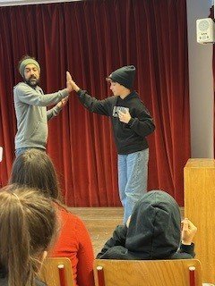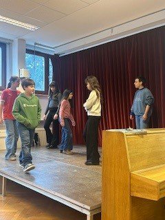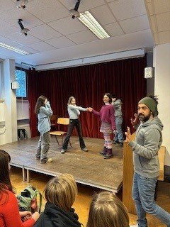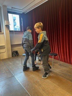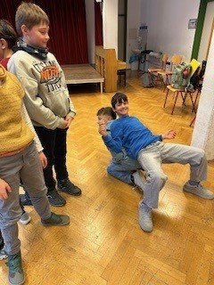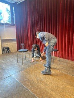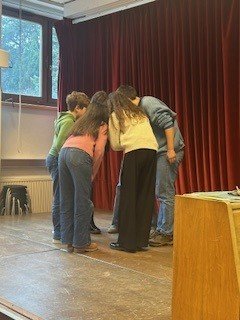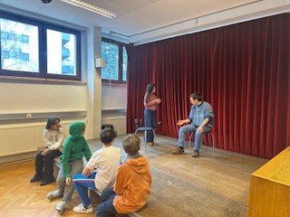 Die beiden Theaterpädagog:innen des Theaters der Jugend, Katja und Ahmad, arbeiteten mit den Schüler:innen auf der Bühne spielerisch und kreativ zum Schwerpunkt Teamwork. Im Zentrum standen Fragen zu Gruppenzugehörigkeit, Integrität und Ausgrenzung: Wie verhält man sich in einer Gruppe? Was braucht es, um Teil einer Gemeinschaft zu sein? Und wie fühlt es sich an, allein zu stehen?