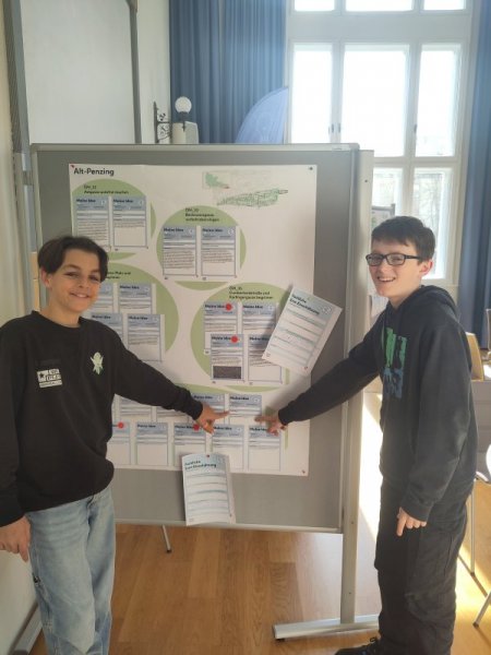 Um dieses Angebot zu nutzen, wurden Kurzexkursionen in die Bezirksvorstehung organisiert. Die Klassen 4A, 4E, 4F und 7Br nahmen daran teil. Jede:r Schüler:in bekam den Auftrag, sich die Ausstellung genau anzusehen, um die besten Ideen ausfindig zu machen. Viele Schüler:innen entdeckten in der Ausstellung auch ihre eigenen Ideen! Manchmal waren diese zu Gruppen zusammengefasst worden, andere wurden abgelehnt, doch viele werden aktuell vom Klimateam Penzing näher geprüft und für die dritte Phase vorbereitet.
