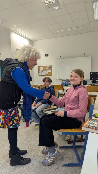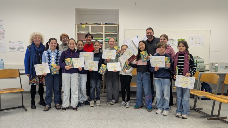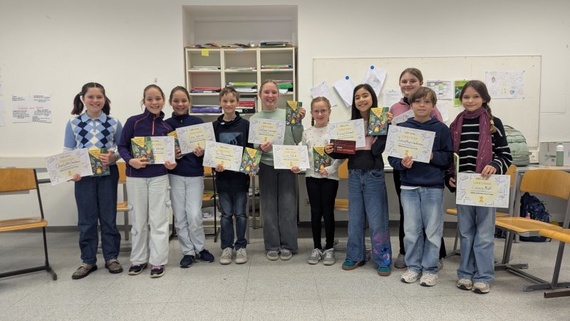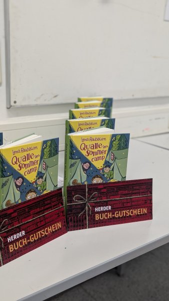 Die Teilnehmenden erhielten alle eine Urkunden und die 1. Klassen-Schüler:innen das Buch „Qualle im Sommercamp“, die die Autorin für jede:n signierte. Die Schüler:innen der 2. Klasse erhielten einen 10.- Büchergutschein. Die Sieger:innen gewannen zusätzlich einen 20.- Büchergutschein.